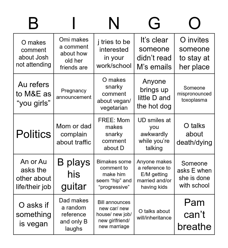 This bingo card has a free space and 24 words: B plays his guitar, Dad makes a random reference and only B laughs, O makes snarky comment about vegan/ vegetarian, O asks if something is vegan, O invites someone to stay at her place, O makes comment about Josh not attending, Au refers to M&E as “you girls”, Omi makes a comment about how old her friends are, UD smiles at you awkwardly while you’re talking, Bimakes some comment to make him seem “hip” and “progressive”, Anyone brings up little D and the hot dog, Politics, Anyone makes a reference to E/M getting married and/or having kids, Someone asks E when she is done with school, Pregnancy announcement, O talks about will/inheritance, O talks about death/dying, j tries to be interested in your work/school, Someone mispronounced toxoplasma, Mom or dad complain about traffic, Pam can’t breathe, An or Au asks the other about life/their job, It’s clear someone didn’t read M’s emails and Bill announces new car/ new house/ new job/ new girlfriend/ new marriage.