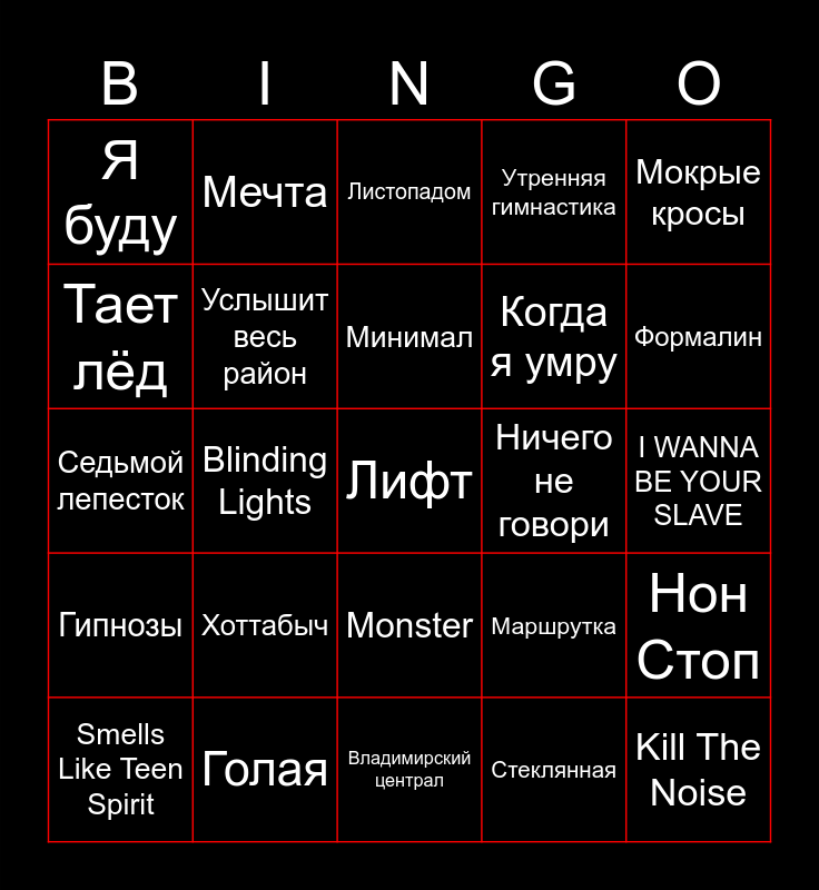 This bingo card has 42 words: Я свободен, Минимал, Поболело и прошло, Хоттабыч, Стеклянная, Нон Стоп, Лифт, Captain, Листопадом, Monster, I WANNA BE YOUR SLAVE, Формалин, Blinding Lights, Мокрые кросы, Отпускай, Маршрутка, Bang, Седьмой лепесток, До встречи на танцполе, Мечта, Тает лёд, 3-сентября, Kill The Noise, Я буду, Эйя, Вологда, Когда я умру, Звезда, Feel Good Inc, Lumen - Сид и Ненси, Луна не знает пути, Гипнозы, Услышит весь район, Владимирский централ, Ягода-малинка, Smells Like Teen Spirit, Голая, Ничего не говори, Где нас нет, Gangnam Style, Утренняя гимнастика and Лучшая ночь.