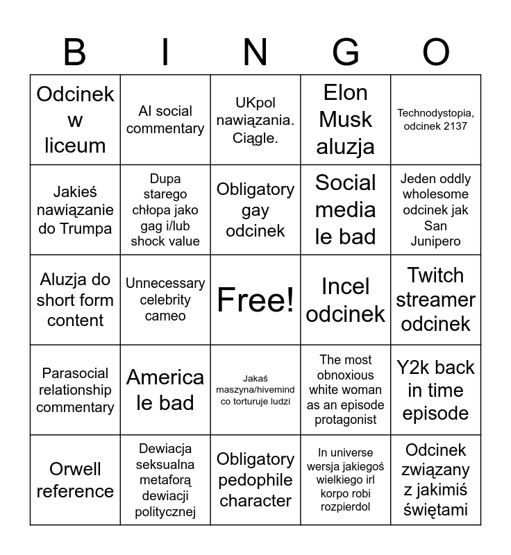 This bingo card has a free space and 24 words: America le bad, Dewiacja seksualna metaforą dewiacji politycznej, Obligatory gay odcinek, Orwell reference, Technodystopia, odcinek 2137, Odcinek w liceum, Jakieś nawiązanie do Trumpa, AI social commentary, Incel odcinek, Jakaś maszyna/hivemind co torturuje ludzi, Social media le bad, Aluzja do short form content, The most obnoxious white woman as an episode protagonist, Y2k back in time episode, Dupa starego chłopa jako gag i/lub shock value, In universe wersja jakiegoś wielkiego irl korpo robi rozpierdol, Twitch streamer odcinek, UKpol nawiązania. Ciągle., Jeden oddly wholesome odcinek jak San Junipero, Unnecessary celebrity cameo, Odcinek związany z jakimiś świętami, Parasocial relationship commentary, Elon Musk aluzja and Obligatory pedophile character.