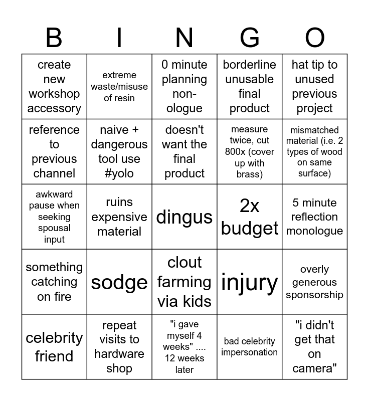 This bingo card has a free space and 24 words: sodge, repeat visits to hardware shop, doesn't want the final product, celebrity friend, hat tip to unused previous project, create new workshop accessory, reference to previous channel, extreme waste/misuse of resin, 2x budget, clout farming via kids, measure twice, cut 800x (cover up with brass), awkward pause when seeking spousal input, injury, overly generous sponsorship, naive + dangerous tool use #yolo, bad celebrity impersonation, 5 minute reflection monologue, 0 minute planning non-ologue, mismatched material (i.e. 2 types of wood on same surface), ruins expensive material, "i didn't get that on camera", something catching on fire, borderline unusable final product and "i gave myself 4 weeks" .... 12 weeks later.