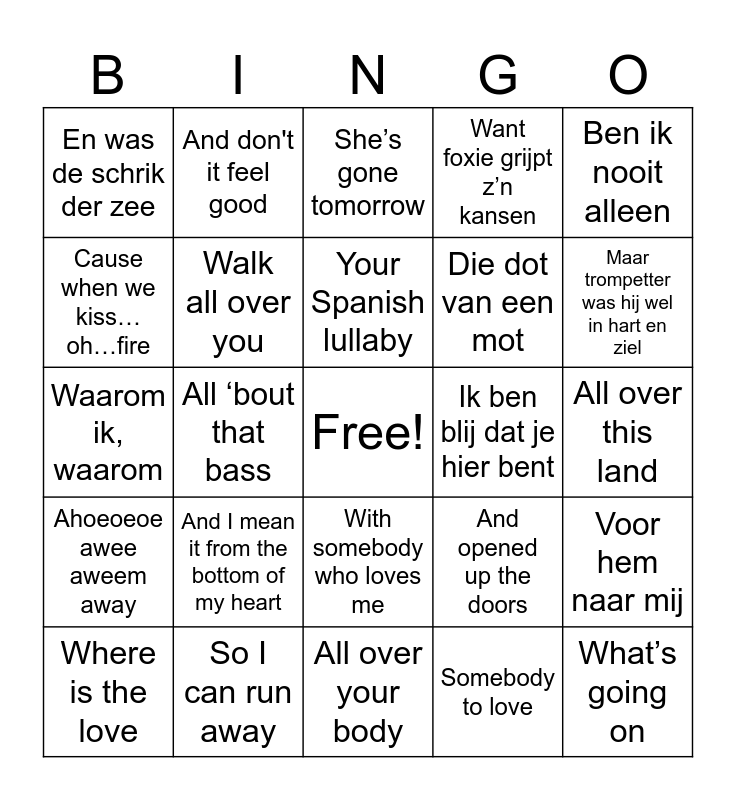This bingo card has a free space and 39 words: Ik geef je de morgen terug, Om iets fout te doen, Plenty of room at the Hotel California, Walk all over you, Where is the love, With somebody who loves me, Your Spanish lullaby, 'Cause you're there for me too, Ben ik nooit alleen, Ahoeoeoe awee aweem away, All ‘bout that bass, Want foxie grijpt z’n kansen, What’s going on, All over this land, Ik ben blij dat je hier bent, And I mean it from the bottom of my heart, En naar de Notre-Dame en naar de Seine, En was de schrik der zee, And I'll be knocking on your door, And opened up the doors, Cause when we kiss…oh…fire, All over your body, Die dot van een mot, Maar trompetter was hij wel in hart en ziel, Mij de sleutel terug te geven, Nobody’s wife, Oh, when the saints go marching in, Ik ben zo bang, World goed round and round, And don't it feel good, Ik hoop dat je het leuk vond, Rollin' on the river, She’s gone tomorrow, So I can run away, Somebody to love, Und für einander immer nur da, Voor hem naar mij, Waarom ik, waarom and I'm loving angels instead.