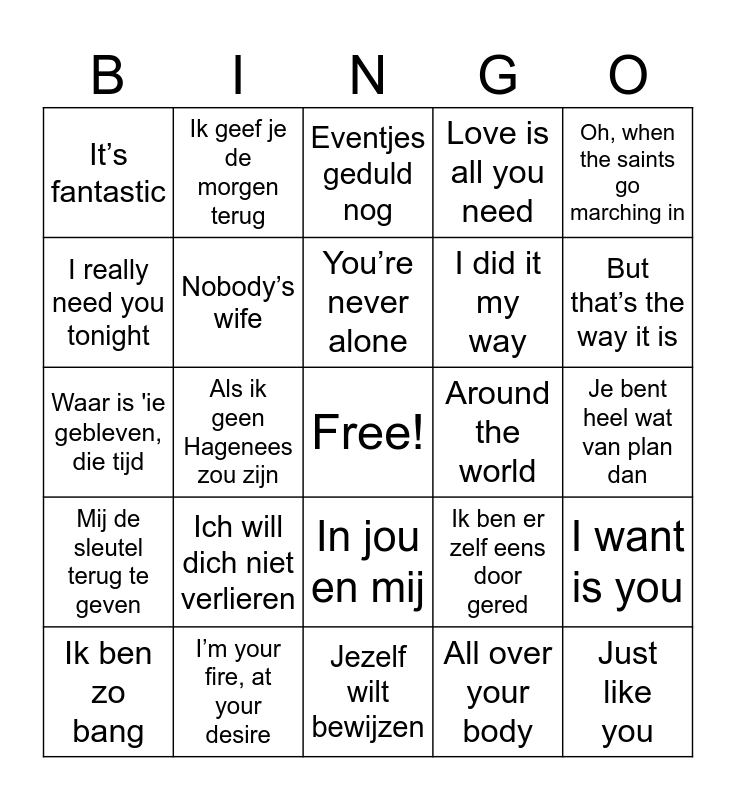 This bingo card has a free space and 34 words: Cause when we kiss…oh…fire, All over your body, Die dot van een mot, Do I pray, Mij de sleutel terug te geven, Nobody’s wife, Oh, when the saints go marching in, Ik ben zo bang, Ik geef je de morgen terug, Om iets fout te doen, You’re never alone, Eventjes geduld nog, Hoe zijn we hier beland, hoehoe, And the world will be as one, Around the world, But that’s the way it is, I’m your fire, at your desire, Waar is 'ie gebleven, die tijd, Ich will dich niet verlieren, Ik ben er zelf eens door gered, In jou en mij, In the air, It’s fantastic, Je bent heel wat van plan dan, Jezelf wilt bewijzen, Just like you, Love is all you need, Maar trompetter was hij wel in hart en ziel, I did it my way, I really need you tonight, All the time, Als ik geen Hagenees zou zijn, I want is you and I will survive.
