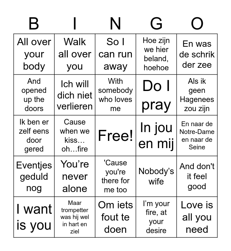 This bingo card has a free space and 63 words: All over this land, Ik ben blij dat je hier bent, World goed round and round, And don't it feel good, Ik hoop dat je het leuk vond, I'm loving angels instead, Walk all over you, Where is the love, With somebody who loves me, Your Spanish lullaby, 'Cause you're there for me too, And I mean it from the bottom of my heart, En naar de Notre-Dame en naar de Seine, En was de schrik der zee, And I'll be knocking on your door, And opened up the doors, Cause when we kiss…oh…fire, All over your body, Die dot van een mot, Do I pray, You’re never alone, Eventjes geduld nog, Hoe zijn we hier beland, hoehoe, And the world will be as one, Around the world, But that’s the way it is, I did it my way, I really need you tonight, Ben ik nooit alleen, Ahoeoeoe awee aweem away, All ‘bout that bass, Want foxie grijpt z’n kansen, What’s going on, All the time, Als ik geen Hagenees zou zijn, I want is you, I will survive, I’m your fire, at your desire, Waar is 'ie gebleven, die tijd, Ich will dich niet verlieren, Ik ben er zelf eens door gered, In jou en mij, Jezelf wilt bewijzen, Just like you, Love is all you need, Maar trompetter was hij wel in hart en ziel, Mij de sleutel terug te geven, Nobody’s wife, Oh, when the saints go marching in, Ik ben zo bang, Ik geef je de morgen terug, Om iets fout te doen, Plenty of room at the Hotel California, Rollin' on the river, She’s gone tomorrow, So I can run away, Somebody to love, Und für einander immer nur da, Voor hem naar mij, Waarom ik, waarom, In the air, It’s fantastic and Je bent heel wat van plan dan.