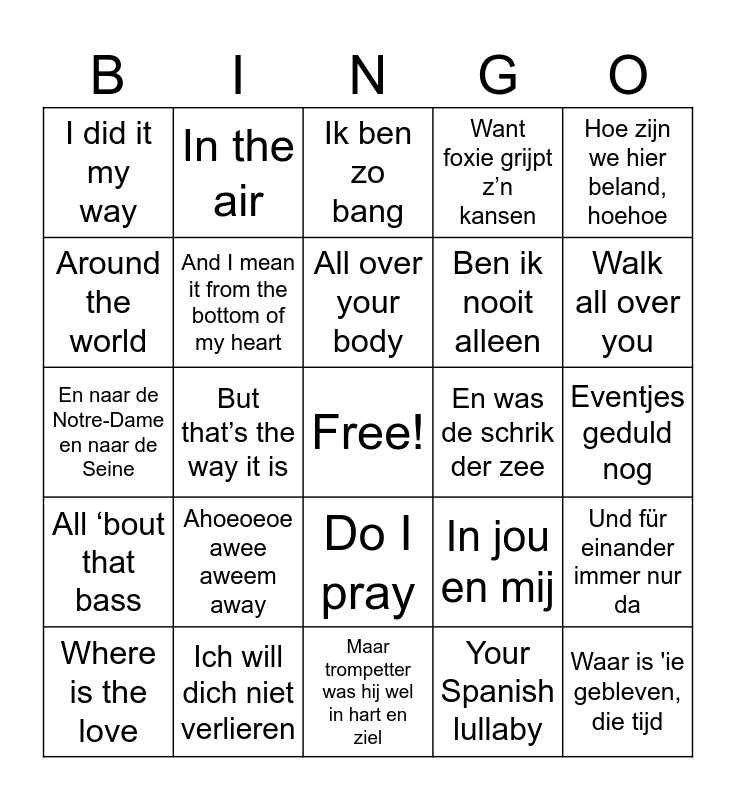 This bingo card has a free space and 63 words: And opened up the doors, So I can run away, Somebody to love, Und für einander immer nur da, Voor hem naar mij, Waarom ik, waarom, In the air, Cause when we kiss…oh…fire, All over your body, Die dot van een mot, Do I pray, You’re never alone, Eventjes geduld nog, Hoe zijn we hier beland, hoehoe, And the world will be as one, Around the world, But that’s the way it is, I did it my way, I really need you tonight, Ben ik nooit alleen, Ahoeoeoe awee aweem away, All ‘bout that bass, Want foxie grijpt z’n kansen, What’s going on, All the time, Als ik geen Hagenees zou zijn, I want is you, I will survive, All over this land, Ik ben blij dat je hier bent, World goed round and round, And don't it feel good, Ik hoop dat je het leuk vond, I'm loving angels instead, Walk all over you, Where is the love, With somebody who loves me, Your Spanish lullaby, 'Cause you're there for me too, And I mean it from the bottom of my heart, En naar de Notre-Dame en naar de Seine, En was de schrik der zee, And I'll be knocking on your door, I’m your fire, at your desire, Waar is 'ie gebleven, die tijd, Ich will dich niet verlieren, Ik ben er zelf eens door gered, In jou en mij, Jezelf wilt bewijzen, Just like you, Love is all you need, Maar trompetter was hij wel in hart en ziel, Mij de sleutel terug te geven, Nobody’s wife, Oh, when the saints go marching in, Ik ben zo bang, Ik geef je de morgen terug, Om iets fout te doen, Plenty of room at the Hotel California, Rollin' on the river, She’s gone tomorrow, It’s fantastic and Je bent heel wat van plan dan.