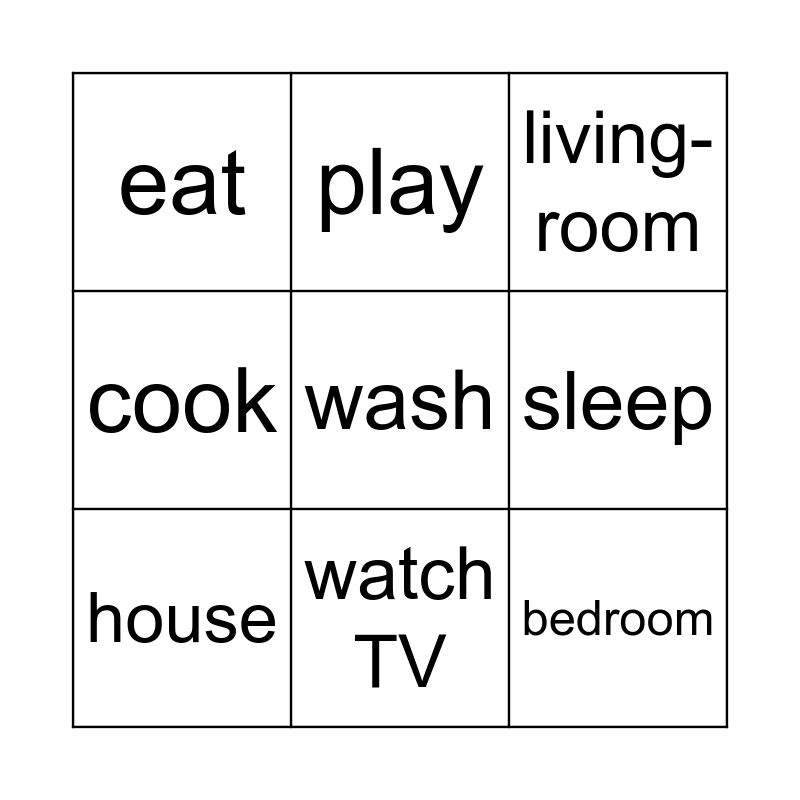 This bingo card has a free space and 8 words: sleep, living-room, play, house, eat, bedroom, cook and watch TV.