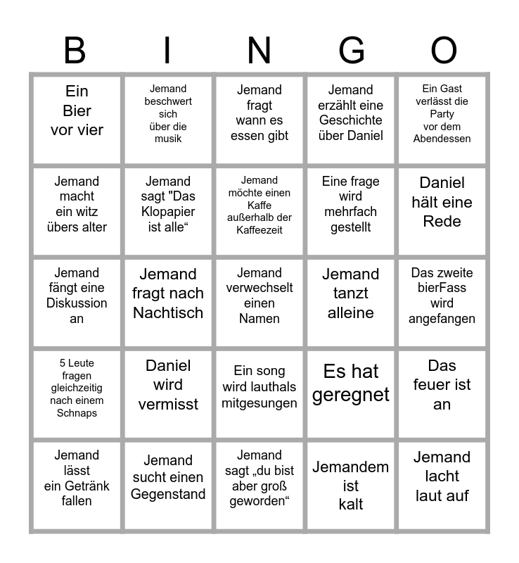 This bingo card has 25 words: Daniel wird vermisst, Jemand sagt „du bist aber groß geworden“, Jemand möchte einen Kaffe außerhalb der Kaffeezeit, Jemand lässt ein Getränk fallen, Ein Gast verlässt die Party vor dem Abendessen, Ein Bier vor vier, Jemand macht ein witz übers alter, Jemand beschwert sich über die musik, Jemand tanzt alleine, Ein song wird lauthals mitgesungen, Eine frage wird mehrfach gestellt, Jemand fängt eine Diskussion an, Es hat geregnet, Das feuer ist an, Jemand sagt "Das Klopapier ist alle“, Jemand lacht laut auf, Das zweite bierFass wird angefangen, Jemand fragt wann es essen gibt, Daniel hält eine Rede, Jemand fragt nach Nachtisch, Jemand verwechselt einen Namen, Jemand sucht einen Gegenstand, 5 Leute fragen gleichzeitig nach einem Schnaps, Jemand erzählt eine Geschichte über Daniel and Jemandem ist kalt.