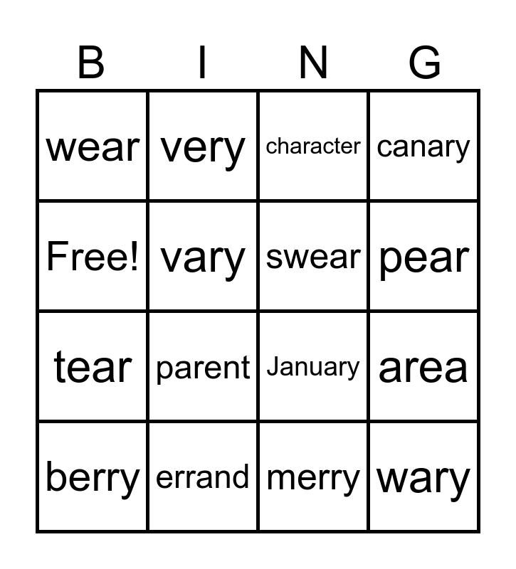This bingo card has 16 words: errand, area, character, wear, tear, very, January, merry, Free!, vary, berry, canary, parent, pear, swear and wary.