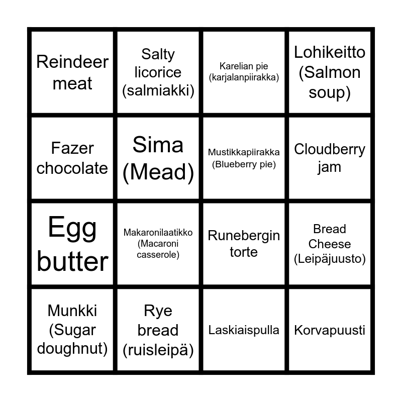 This bingo card has 16 words: Rye bread (ruisleipä), Bread Cheese (Leipäjuusto), Karelian pie (karjalanpiirakka), Reindeer meat, Egg butter, Salty licorice (salmiakki), Runebergin torte, Laskiaispulla, Fazer chocolate, Sima (Mead), Munkki (Sugar doughnut), Lohikeitto (Salmon soup), Makaronilaatikko (Macaroni casserole), Cloudberry jam, Mustikkapiirakka (Blueberry pie) and Korvapuusti.