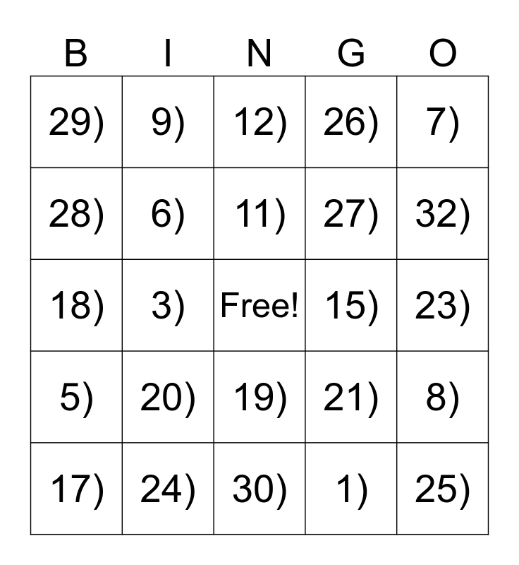 This bingo card has a free space and 32 words: 1), 2), 3), 4), 5), 6), 7), 8), 9), 10), 11), 12), 13), 14), 15), 16), 17), 18), 19), 20), 21), 22), 23), 24), 25), 26), 27), 28), 29), 30), 31) and 32).