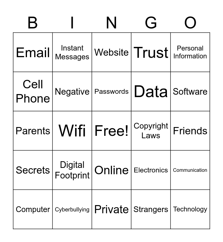 This bingo card has a free space and 24 words: Digital Footprint, Cyberbullying, Passwords, Computer, Personal Information, Email, Cell Phone, Instant Messages, Copyright Laws, Online, Data, Parents, Electronics, Communication, Negative, Strangers, Friends, Website, Software, Wifi, Technology, Secrets, Trust and Private.
