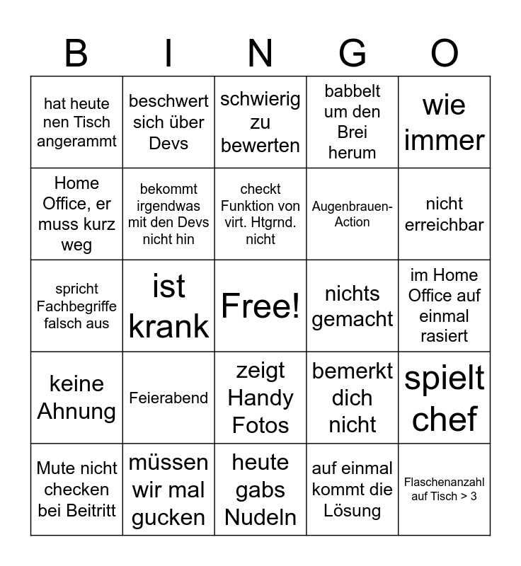 This bingo card has a free space and 24 words: Feierabend, müssen wir mal gucken, checkt Funktion von virt. Htgrnd. nicht, Mute nicht checken bei Beitritt, wie immer, hat heute nen Tisch angerammt, Home Office, er muss kurz weg, beschwert sich über Devs, nichts gemacht, zeigt Handy Fotos, Augenbrauen-Action, spricht Fachbegriffe falsch aus, bemerkt dich nicht, spielt chef, bekommt irgendwas mit den Devs nicht hin, auf einmal kommt die Lösung, im Home Office auf einmal rasiert, schwierig zu bewerten, nicht erreichbar, ist krank, Flaschenanzahl auf Tisch > 3, keine Ahnung, babbelt um den Brei herum and heute gabs Nudeln.