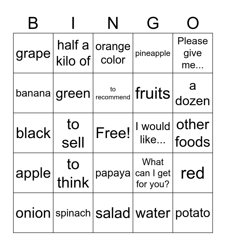 This bingo card has a free space and 54 words: strawberry, apple, melon, orange fruit, papaya, cucumber, pineapple, plantain, banana, watermelon, grape, lettuce, spinach, onion, poblano chile, salad, potato, fruits, vegetables, other foods, What can I get for you?, I'd like/I want...., I would like..., Please give me..., a kilo of, half a kilo of, 1/4 kilo of, 100 grams, beverages, water, fruit-flavored water, smoothie/shake, juice, colors, orange color, yellow, black, red, pink, green, verbs, to drink, to buy, to ask for/order, to think, to prefer, to try, to want, to recommend, to sell, a dozen, How much is it?, It'll be 30 pesos and Here you go.