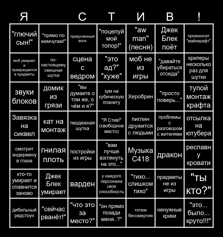 This bingo card has a free space and 48 words: "тихо... слишком тихо", "давайте убираться отсюда", "он прямо позади меня..?", кат на монтаж, "вы думаете о том же, о чём и я?", отсылка на ютубера, "прямо по жемчугам!", "сейчас рванёт!", Джек Блек поёт, "вам лучше взглянуть на это...", произносят "майнкрафт", "поцелуй мой топор!", "просто поверь...", Херобрин, кто-то умирает и спавнится заново, проблемы с разговором с жителями, моб умирает и превращается в предметы, криперы несколько раз для шутки, предметы не из игры, "aw man" (песня), моб не из игры, пердежная шутка, "глючий сын!", по-настоящему смешная шутка, "ты кто?", сцена с ведром, тупой монтаж крафта, дибильный редстоун, зум на кубическую планету, домик из грязи, ненужные крики, пиглин дружится с людьми, респавн у кровати, Джек Блек умирает, Завязка на сиквел, Музыка C418, дракон, звуки блоков, постройки из игры, варден, смотрит эндермену в глаза, "это... было... круто!!!", прирученный волк, "что это за место?", "это ад?" "хуже", у каждого персонажа своя способность, гнилая плоть and тотем бессмертия.