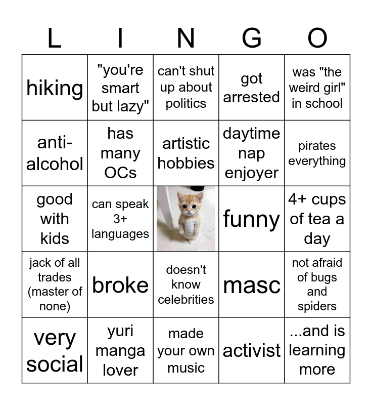 This bingo card has a free space and 24 words: broke, yuri manga lover, artistic hobbies, very social, was "the weird girl" in school, hiking, anti-alcohol, "you're smart but lazy", funny, doesn't know celebrities, daytime nap enjoyer, good with kids, masc, not afraid of bugs and spiders, has many OCs, activist, 4+ cups of tea a day, can't shut up about politics, pirates everything, can speak 3+ languages, ...and is learning more, jack of all trades (master of none), got arrested and made your own music.