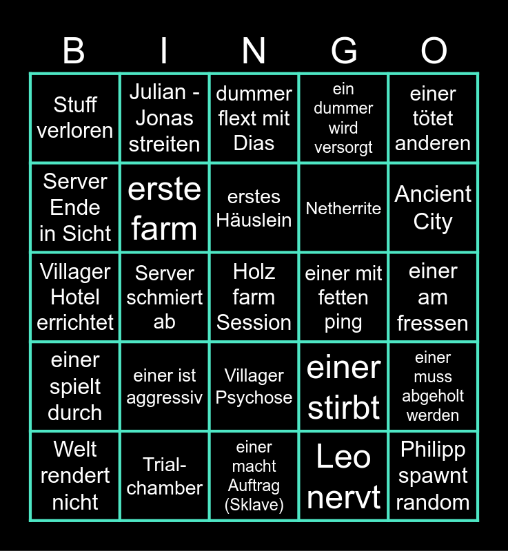 This bingo card has a free space and 24 words: einer ist aggressiv, Trial- chamber, erstes Häuslein, Welt rendert nicht, einer tötet anderen, Stuff verloren, Server Ende in Sicht, Julian - Jonas streiten, einer mit fetten ping, Villager Psychose, Netherrite, Villager Hotel errichtet, einer stirbt, einer muss abgeholt werden, erste farm, Leo nervt, einer am fressen, dummer flext mit Dias, Ancient City, Server schmiert ab, Philipp spawnt random, einer spielt durch, ein dummer wird versorgt and einer macht Auftrag (Sklave).