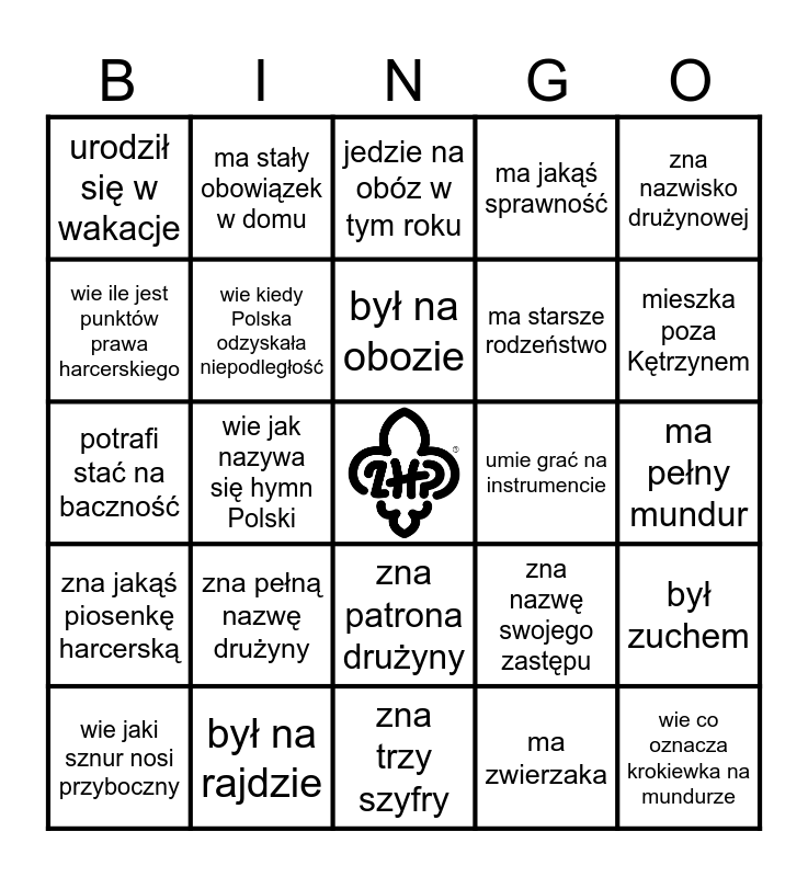 This bingo card has a free space and 24 words: zna pełną nazwę drużyny, był na rajdzie, był na obozie, wie jaki sznur nosi przyboczny, zna nazwisko drużynowej, urodził się w wakacje, wie ile jest punktów prawa harcerskiego, ma stały obowiązek w domu, umie grać na instrumencie, zna patrona drużyny, ma starsze rodzeństwo, potrafi stać na baczność, zna nazwę swojego zastępu, był zuchem, wie kiedy Polska odzyskała niepodległość, ma zwierzaka, ma pełny mundur, jedzie na obóz w tym roku, mieszka poza Kętrzynem, wie jak nazywa się hymn Polski, wie co oznacza krokiewka na mundurze, zna jakąś piosenkę harcerską, ma jakąś sprawność and zna trzy szyfry.