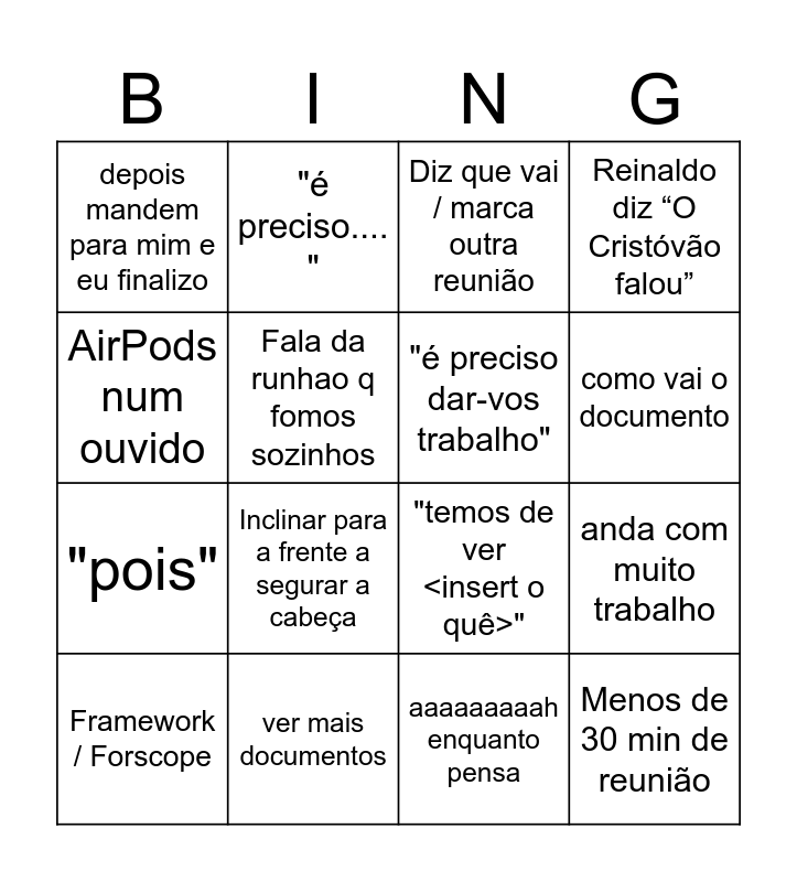 This bingo card has 16 words: ver mais documentos, anda com muito trabalho, Diz que vai / marca outra reunião, depois mandem para mim e eu finalizo, "pois", "é preciso.... ", "temos de ver <insert o quê>", aaaaaaaaah enquanto pensa, AirPods num ouvido, Fala da runhao q fomos sozinhos, Framework / Forscope, Reinaldo diz “O Cristóvão falou”, Inclinar para a frente a segurar a cabeça, como vai o documento, "é preciso dar-vos trabalho" and Menos de 30 min de reunião.