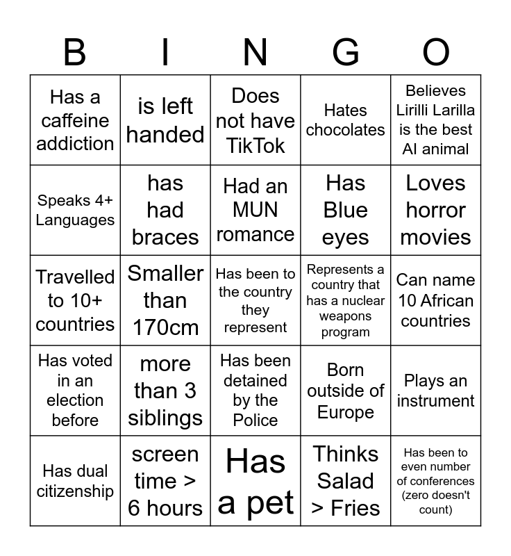 This bingo card has a free space and 24 words: more than 3 siblings, screen time > 6 hours, Had an MUN romance, Has dual citizenship, Believes Lirilli Larilla is the best AI animal, Has a caffeine addiction, Speaks 4+ Languages, is left handed, Represents a country that has a nuclear weapons program, Has been detained by the Police, Has Blue eyes, Travelled to 10+ countries, Born outside of Europe, Plays an instrument, has had braces, Thinks Salad > Fries, Can name 10 African countries, Does not have TikTok, Loves horror movies, Smaller than 170cm, Has been to even number of conferences (zero doesn't count), Has voted in an election before, Hates chocolates and Has a pet.