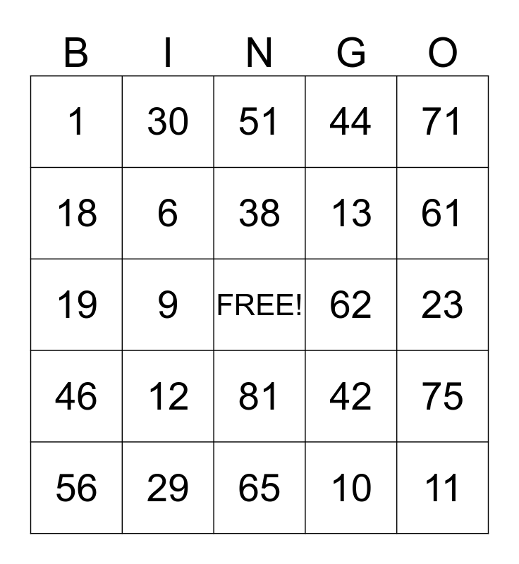 This bingo card has a free space and 24 words: 12, 29, 38, 56, 71, 1, 18, 30, 62, 81, 13, 19, 42, 75, 6, 10, 23, 51, 61, 9, 11, 46, 44 and 65.
