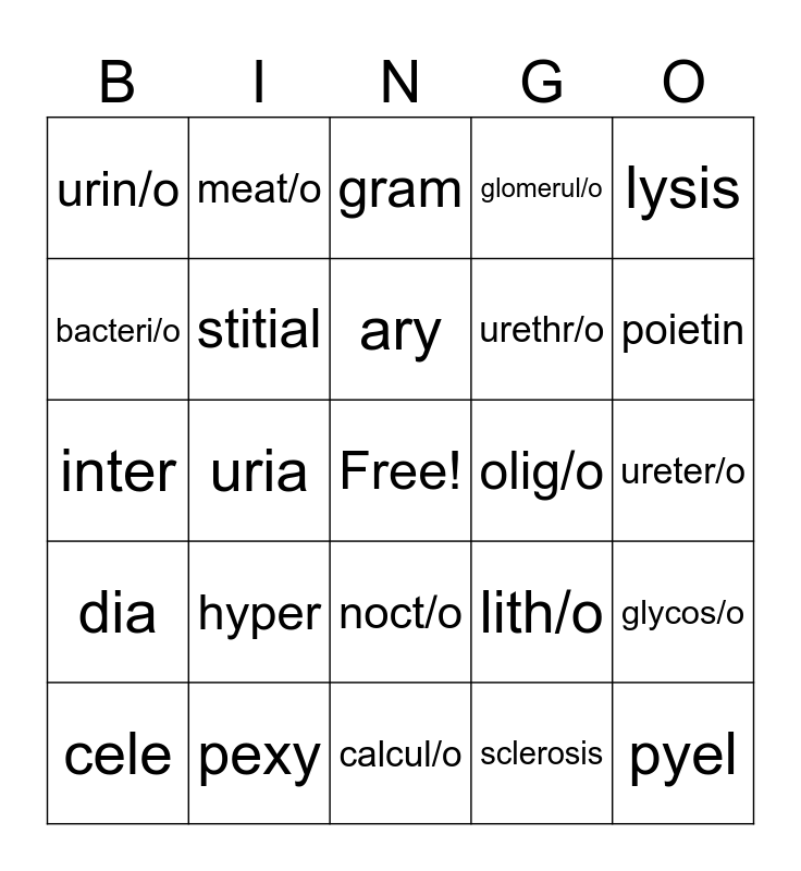 This bingo card has a free space and 24 words: hyper, pexy, ary, cele, lysis, urin/o, bacteri/o, meat/o, olig/o, noct/o, urethr/o, inter, lith/o, glycos/o, stitial, sclerosis, ureter/o, gram, poietin, uria, pyel, dia, glomerul/o and calcul/o.