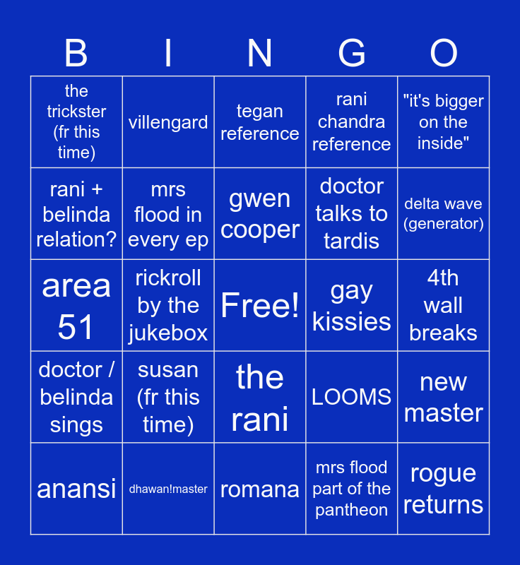 This bingo card has a free space and 24 words: susan (fr this time), dhawan!master, gwen cooper, anansi, "it's bigger on the inside", the trickster (fr this time), rani + belinda relation?, villengard, gay kissies, the rani, doctor talks to tardis, area 51, LOOMS, new master, mrs flood in every ep, mrs flood part of the pantheon, 4th wall breaks, tegan reference, delta wave (generator), rickroll by the jukebox, rogue returns, doctor / belinda sings, rani chandra reference and romana.