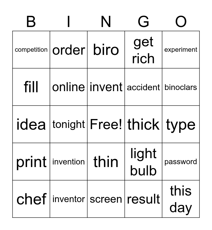 This bingo card has a free space and 24 words: invention, inventor, invent, chef, experiment, competition, fill, order, thick, thin, accident, idea, light bulb, password, online, result, type, biro, binoclars, tonight, this day, print, get rich and screen.
