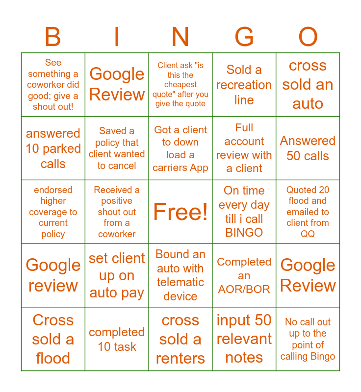 This bingo card has a free space and 24 words: Cross sold a flood, set client up on auto pay, Got a client to down load a carriers App, input 50 relevant notes, cross sold an auto, See something a coworker did good; give a shout out!, Google Review, Client ask "is this the cheapest quote" after you give the quote, On time every day till i call BINGO, Quoted 20 flood and emailed to client from QQ, endorsed higher coverage to current policy, Saved a policy that client wanted to cancel, Completed an AOR/BOR, Google Review, answered 10 parked calls, completed 10 task, cross sold a renters, Sold a recreation line, Answered 50 calls, Google review, Received a positive shout out from a coworker, Bound an auto with telematic device, Full account review with a client and No call out up to the point of calling Bingo.