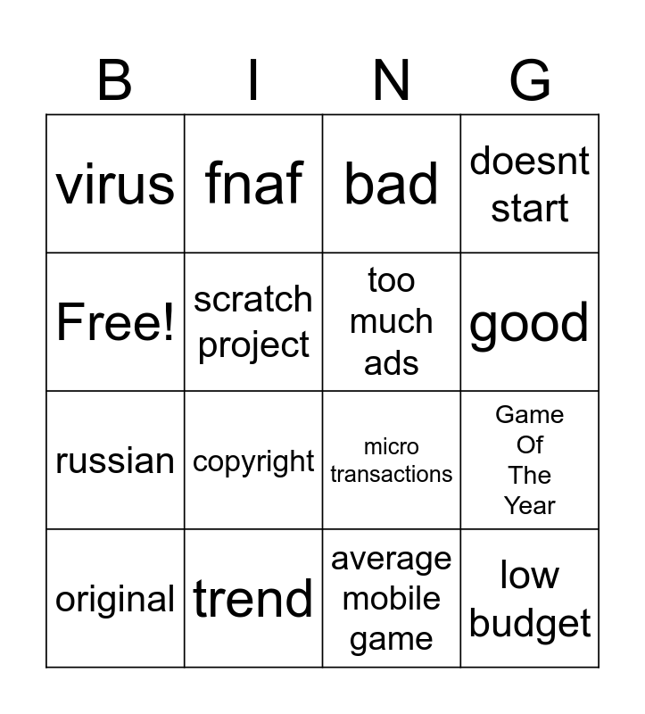 This bingo card has 16 words: trend, Game Of The Year, bad, virus, russian, fnaf, micro transactions, average mobile game, Free!, scratch project, original, doesnt start, copyright, good, too much ads and low budget.
