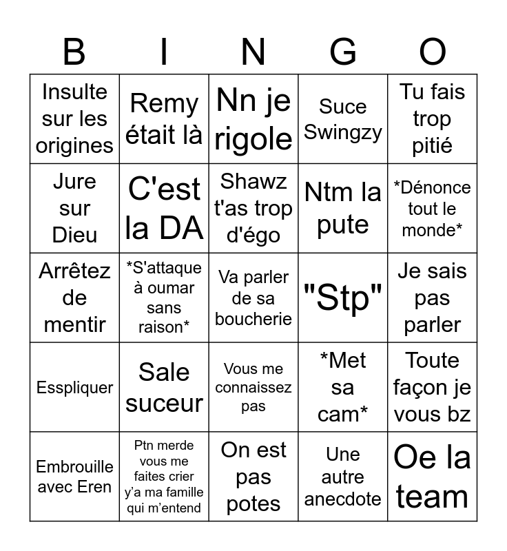 This bingo card has 25 words: Sale suceur, On est pas potes, Shawz t'as trop d'égo, Embrouille avec Eren, Tu fais trop pitié, Insulte sur les origines, Jure sur Dieu, Remy était là, "Stp", Vous me connaissez pas, Ntm la pute, Arrêtez de mentir, *Met sa cam*, Toute façon je vous bz, C'est la DA, Oe la team, Je sais pas parler, Nn je rigole, *Dénonce tout le monde*, *S'attaque à oumar sans raison*, Va parler de sa boucherie, Ptn merde vous me faites crier y’a ma famille qui m’entend, Esspliquer, Suce Swingzy and Une autre anecdote.