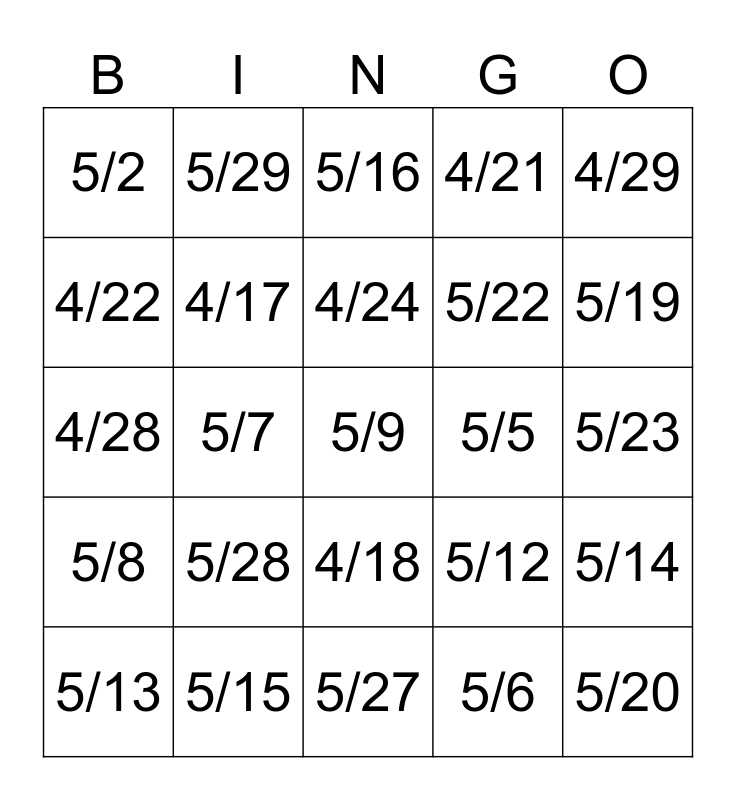 This bingo card has 35 words: 4/14, 4/15, 4/16, 4/17, 4/18, 4/21, 4/22, 4/23, 4/24, 4/25, 4/28, 4/29, 4/30, 5/1, 5/2, 5/5, 5/6, 5/7, 5/8, 5/9, 5/12, 5/13, 5/14, 5/15, 5/16, 5/19, 5/20, 5/21, 5/22, 5/23, 5/26, 5/27, 5/28, 5/29 and 5/30.