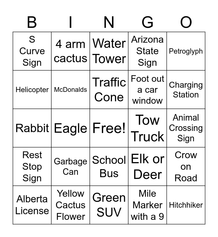 This bingo card has a free space and 34 words: Road Kill, Mile Marker with a 9, Lizard, White Pickup, Rest Stop Sign, McDonalds, Petroglyph, Alberta License, 4 arm cactus, RailRoad Crossing Sign, Traffic Cone, Water Tower, Coyote, Road Runner, Tow Truck, Charging Station, Yellow Cactus Flower, Rabbit, Garbage Can, Elk or Deer, School Bus, National Monument Sign, S Curve Sign, Animal Crossing Sign, Green SUV, Hitchhiker, Arizona State Sign, Speed Limit 55, Foot out a car window, Helicopter, Hot Air Ballon, Eagle, Crow on Road and Road Closed Sign.
