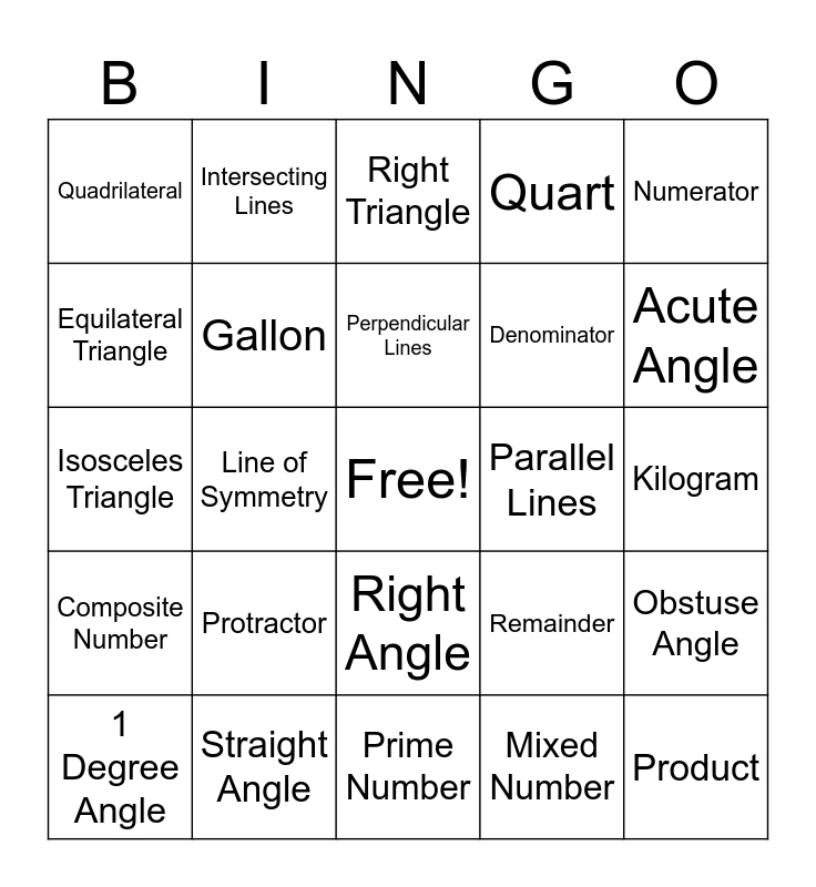 This bingo card has a free space and 24 words: Protractor, Straight Angle, Perpendicular Lines, 1 Degree Angle, Numerator, Quadrilateral, Equilateral Triangle, Intersecting Lines, Parallel Lines, Right Angle, Denominator, Isosceles Triangle, Remainder, Obstuse Angle, Gallon, Mixed Number, Kilogram, Right Triangle, Acute Angle, Line of Symmetry, Product, Composite Number, Quart and Prime Number.