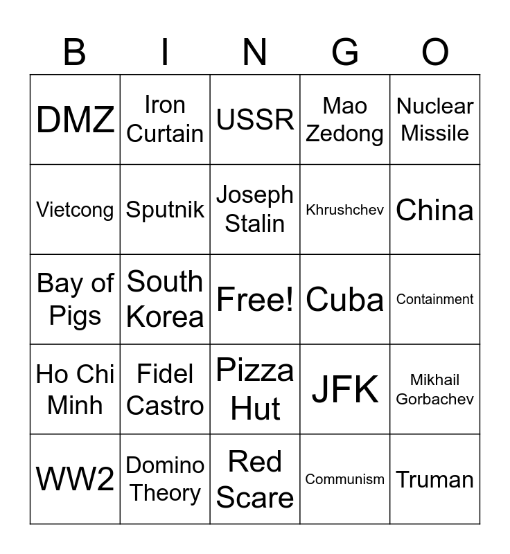 This bingo card has a free space and 29 words: WW2, North Korea, South Korea, Berlin, DMZ, USSR, Sputnik, Fidel Castro, Cuba, Domino Theory, Containment, Truman, Red Scare, Communism, China, Vietnam, Pizza Hut, Ho Chi Minh, Nuclear Missile, Bay of Pigs, JFK, Moon Landing, Khrushchev, Vietcong, Mao Zedong, Iron Curtain, Mikhail Gorbachev, Joseph Stalin and 38th Parallel.
