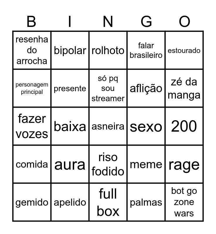 This bingo card has a free space and 29 words: gemido, hello neighbour, baixa, cantar, resenha do arrocha, rolhoto, presente, aura, sexo, apelido, 200, bot go zone wars, full box, palmas, zé da manga, focar, riso fodido, comida, estourado, fazer vozes, meme, audio, aflição, personagem principal, falar brasileiro, bipolar, rage, só pq sou streamer and mentira.