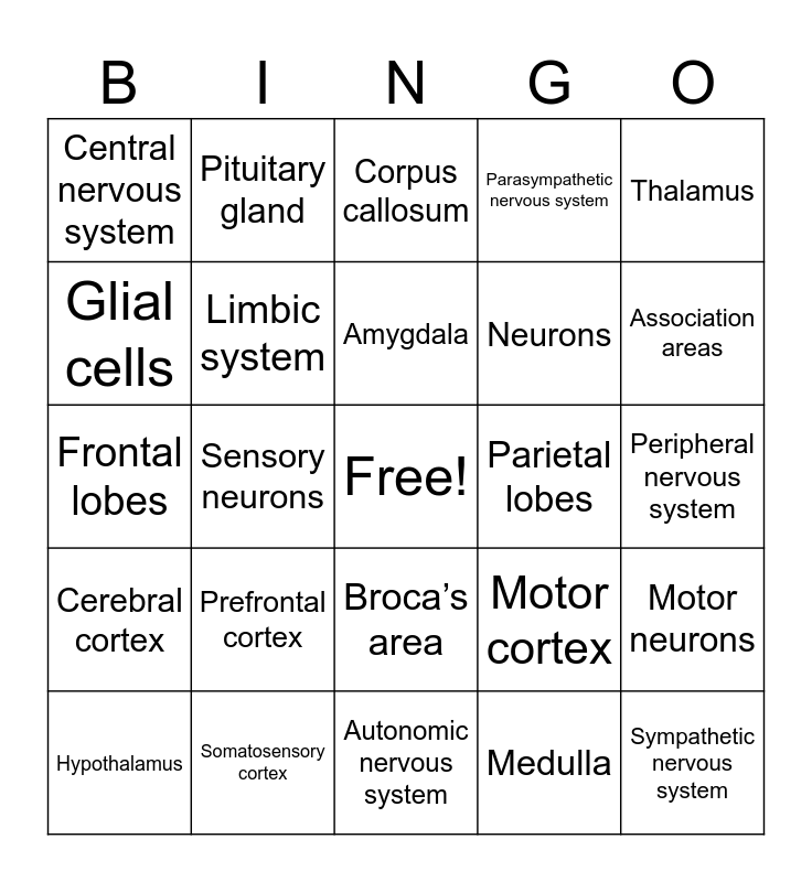 This bingo card has a free space and 34 words: Brainstem, Medulla, Reticular activating system, Cerebellum, Cerebral cortex, Limbic system, Thalamus, Hypothalamus, Pituitary gland, Hippocampus, Amygdala, Corpus callosum, Occipital lobes, Temporal lobes, Parietal lobes, Association areas, Somatosensory cortex, Frontal lobes, Prefrontal cortex, Motor cortex, Broca’s area, Wernicke’s area, Central nervous system, Peripheral nervous system, Autonomic nervous system, Sympathetic nervous system, Parasympathetic nervous system, Somatic nervous system, Neurons, Glial cells, Reflex arc, Sensory neurons, Motor neurons and Interneurons.