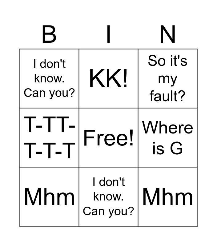 This bingo card has a free space and 12 words: Beth!, I don't know. Can you?, Where is G, I guess, So it's my fault?, T-TT-T-T-T, KK!, Mhm, I don't know. Can you?, Mhm, So it's my fault and Yes.