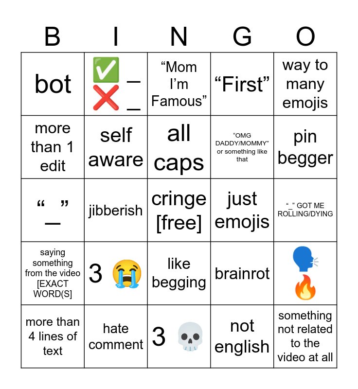 This bingo card has a free space and 24 words: 3 😭, hate comment, all caps, more than 4 lines of text, way to many emojis, bot, more than 1 edit, ✅ _ ❌ _, just emojis, like begging, “OMG DADDY/MOMMY” or something like that, “_”, brainrot, 🗣️🔥, self aware, not english, “_” GOT ME ROLLING/DYING, “Mom I’m Famous”, pin begger, jibberish, something not related to the video at all, saying something from the video [EXACT WORD(S], “First” and 3 💀.