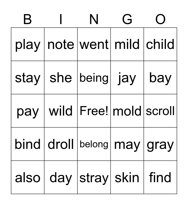 This bingo card has a free space and 39 words: no, he, by, she, also, belong, being, before, child, bind, wild, mild, find, scroll, mold, droll, hold, play, hay, may, stay, stray, jay, bay, Sunday, playtime, fray, subway, state, note, home, hatch, went, day, skin, glide, gray, pay and skill.