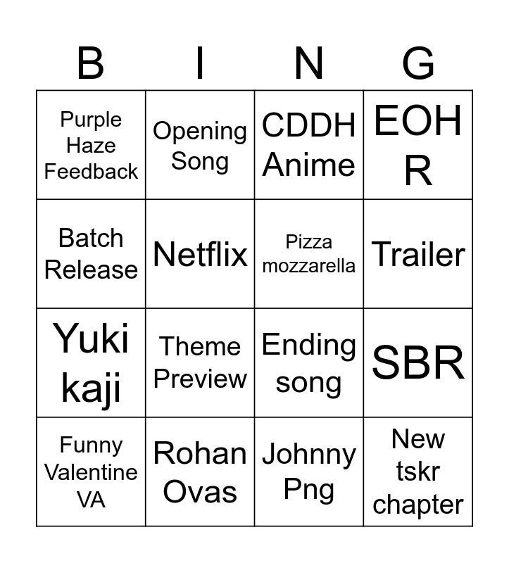 This bingo card has 16 words: Rohan Ovas, SBR, CDDH Anime, Purple Haze Feedback, Yuki kaji, Opening Song, Ending song, Johnny Png, Batch Release, Netflix, Funny Valentine VA, EOH R, Theme Preview, Trailer, Pizza mozzarella and New tskr chapter.