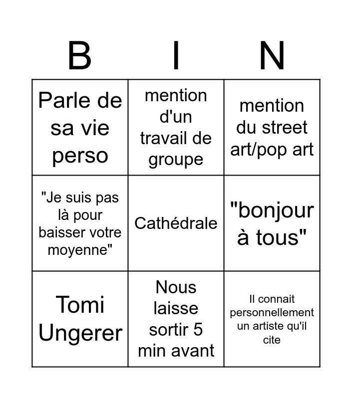 This bingo card has a free space and 8 words: "bonjour à tous", mention du street art/pop art, mention d'un travail de groupe, Tomi Ungerer, Parle de sa vie perso, Il connait personnellement un artiste qu'il cite, "Je suis pas là pour baisser votre moyenne" and Nous laisse sortir 5 min avant.