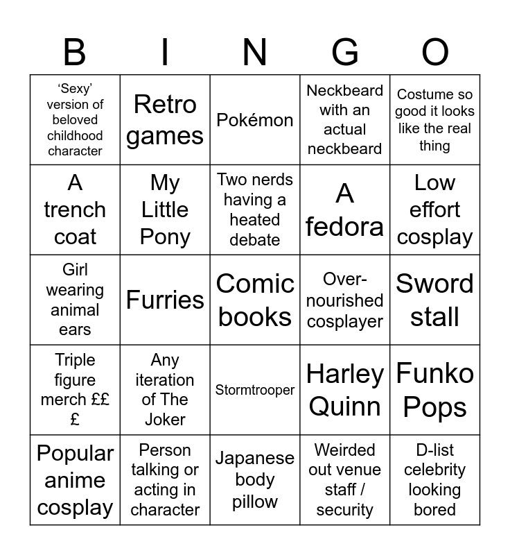 This bingo card has 34 words: D-list celebrity looking bored, Weirded out venue staff / security, Outdated meme, YouTuber merch (PewDiePie, Markiplier, JackSepticEye etc.), Triple figure merch £££, My Little Pony, Costume so good it looks like the real thing, Popular anime cosplay, Retro games, Neckbeard taking a picture with a girl, Two nerds having a heated debate, Pokémon, Genderbent (crossdressing) cosplay, Under-nourished cosplayer, Over-nourished cosplayer, Low effort cosplay, Person talking or acting in character, Girl wearing animal ears, Any iteration of The Joker, Harley Quinn, Stormtrooper, Comically oversized prop, ‘Sexy’ version of beloved childhood character, Sword stall, Japanese body pillow, Comic books, Neckbeard with an actual neckbeard, Man with greasy ponytail, A fedora, A trench coat, Hentai / otherwise inappropriate shirt, Furries, Funko Pops and The room stinks of B.O.