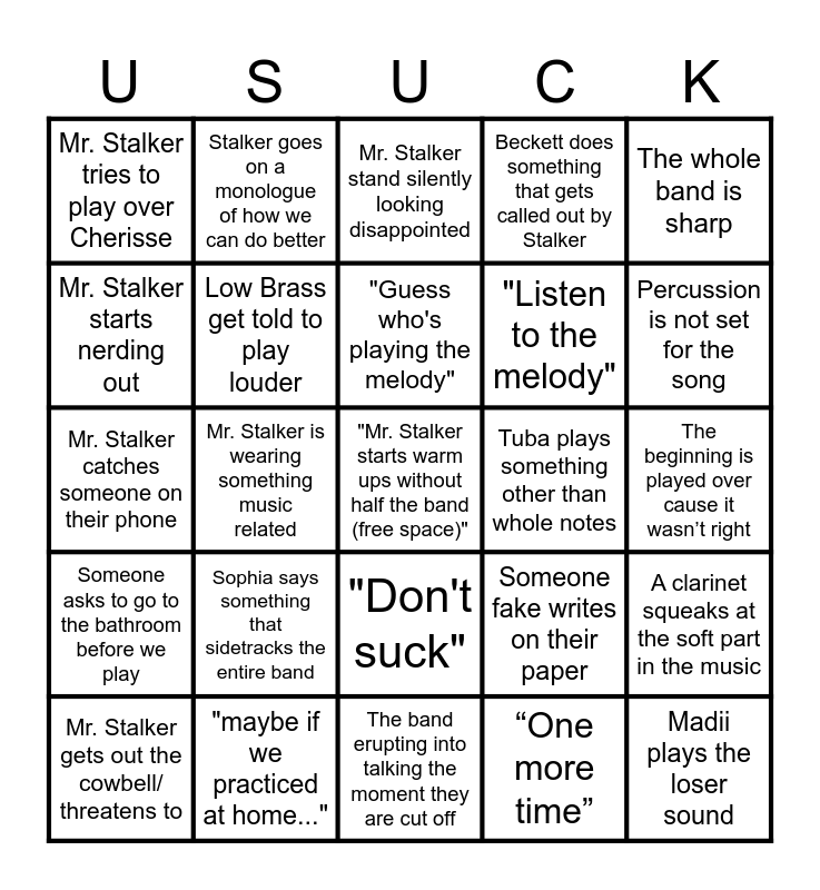 This bingo card has a free space and 34 words: Someone can’t find their music, “One more time”, The melody misses their entrance, The band get told to play bigger at a par, Someone asks to go to the bathroom before we play, Low Brass get told to play louder, The whole band is sharp, Mr. Stalker gets out the cowbell/ threatens to, Stalker goes on a monologue of how we can do better, Mr. Stalker standing wait for band to shut up, "Guess who's playing the melody", Mr. Stalker stand silently looking disappointed, The same measure is played 7 times over, Someone plays 2 measures after the cut off, Tuba plays something other than whole notes, Percussion is not set for the song, "maybe if we practiced at home...", Mr. Stalker catches someone on their phone, Sophia says something that sidetracks the entire band, Someone fake writes on their paper, "Don't suck", Saxes miss their entrance, Mr. Stalker tries to play over Cherisse, The beginning is played over cause it wasn’t right, The band erupting into talking the moment they are cut off, Madii plays the loser sound, Beckett does something that gets called out by Stalker, “LOOK UP”, "Listen to the melody", Mr. Stalker starts nerding out, Someone can’t find their music, Mr. Stalker is wearing something music related, A clarinet squeaks at the soft part in the music and The French Horn looks like their driving a car emptying spit.