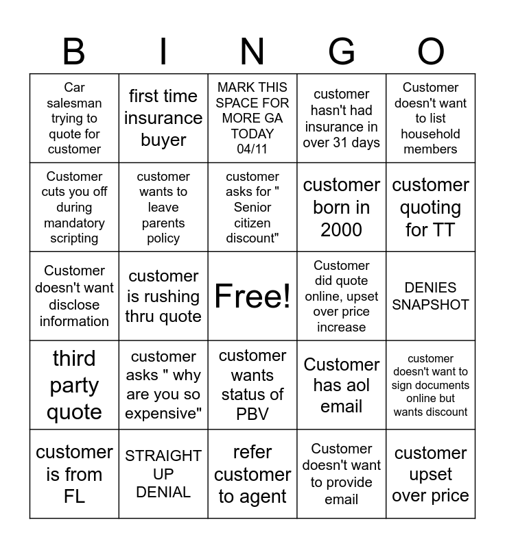 This bingo card has a free space and 24 words: customer asks " why are you so expensive", STRAIGHT UP DENIAL, customer asks for " Senior citizen discount", customer is from FL, Customer doesn't want to list household members, Car salesman trying to quote for customer, Customer cuts you off during mandatory scripting, first time insurance buyer, Customer did quote online, upset over price increase, customer wants status of PBV, customer born in 2000, Customer doesn't want disclose information, Customer has aol email, customer doesn't want to sign documents online but wants discount, customer wants to leave parents policy, Customer doesn't want to provide email, DENIES SNAPSHOT, MARK THIS SPACE FOR MORE GA TODAY 04/11, customer quoting for TT, customer is rushing thru quote, customer upset over price, third party quote, customer hasn't had insurance in over 31 days and refer customer to agent.