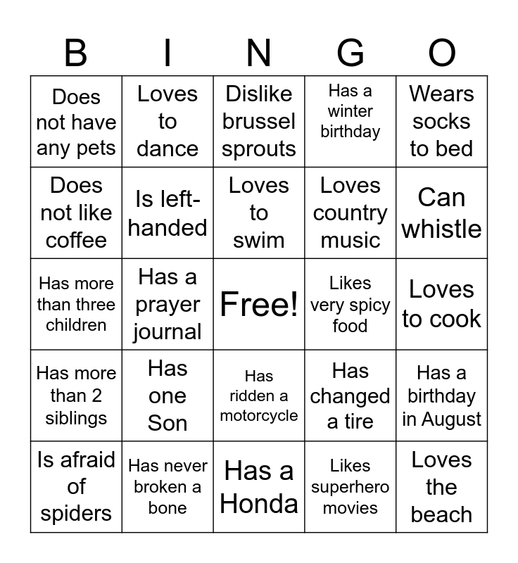 This bingo card has a free space and 24 words: Has one Son, Has never broken a bone, Loves to swim, Is afraid of spiders, Wears socks to bed, Does not have any pets, Does not like coffee, Loves to dance, Likes very spicy food, Has ridden a motorcycle, Loves country music, Has more than three children, Has changed a tire, Has a birthday in August, Is left-handed, Likes superhero movies, Loves to cook, Dislike brussel sprouts, Can whistle, Has a prayer journal, Loves the beach, Has more than 2 siblings, Has a winter birthday and Has a Honda.