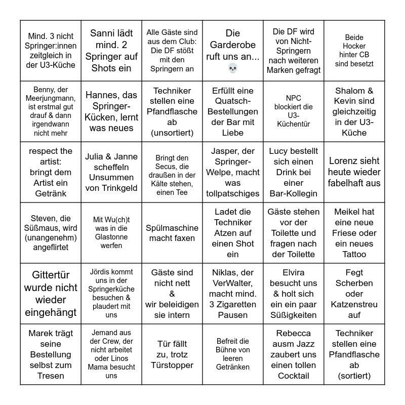 This bingo card has 36 words: Niklas, der VerWalter, macht mind. 3 Zigaretten Pausen, Gäste sind nicht nett & wir beleidigen sie intern, Befreit die Bühne von leeren Getränken, Benny, der Meerjungmann, ist erstmal gut drauf & dann irgendwann nicht mehr, Steven, die Süßmaus, wird (unangenehm) angeflirtet, Jasper, der Springer-Welpe, macht was tollpatschiges, Hannes, das Springer-Kücken, lernt was neues, Tür fällt zu, trotz Türstopper, Die DF wird von Nicht-Springern nach weiteren Marken gefragt, Elvira besucht uns & holt sich ein ein paar Süßigkeiten, Shalom & Kevin sind gleichzeitig in der U3-Küche, Die Garderobe ruft uns an... 💀, Fegt Scherben oder Katzenstreu auf, Julia & Janne scheffeln Unsummen von Trinkgeld, Erfüllt eine Quatsch-Bestellungen der Bar mit Liebe, Mind. 3 nicht Springer:innen zeitgleich in der U3-Küche, Gittertür wurde nicht wieder eingehängt, Lucy bestellt sich einen Drink bei einer Bar-Kollegin, respect the artist: bringt dem Artist ein Getränk, Alle Gäste sind aus dem Club: Die DF stößt mit den Springern an, Bringt den Secus, die draußen in der Kälte stehen, einen Tee, Mit Wu(ch)t was in die Glastonne werfen, Ladet die Techniker Atzen auf einen Shot ein, Spülmaschine macht faxen, Gäste stehen vor der Toilette und fragen nach der Toilette, Sanni lädt mind. 2 Springer auf Shots ein, NPC blockiert die U3-Küchentür, Jemand aus der Crew, der nicht arbeitet oder Linos Mama besucht uns, Techniker stellen eine Pfandflasche ab (unsortiert), Beide Hocker hinter CB sind besetzt, Techniker stellen eine Pfandflasche ab (sortiert), Marek trägt seine Bestellung selbst zum Tresen, Meikel hat eine neue Friese oder ein neues Tattoo, Lorenz sieht heute wieder fabelhaft aus, Jördis kommt uns in der Springerküche besuchen & plaudert mit uns and Rebecca ausm Jazz zaubert uns einen tollen Cocktail.