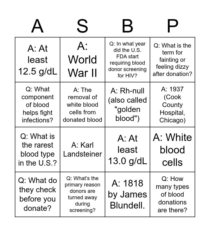 This bingo card has 51 words: Free!, Q: What do they check before you donate?, A: Blood pressure, hemoglobin, temperature, pulse, Q: Which month is National Blood Donor Month in the U.S.?, A: January, Q: Which war led to the development of mobile blood banks?, A: World War II, Q: What is leukoreduction?, A: The removal of white blood cells from donated blood, Q: What is the rarest blood type worldwide?, A: Rh-null (also called "golden blood"), Q: What is the term for fainting or feeling dizzy after donation?, A: Vasovagal response, Q: What gauge needle is commonly used for whole blood donation?, A: 16-gauge, Q: What year was the first blood bank established in the U.S.?, A: 1937 (Cook County Hospital, Chicago), Q: What’s the primary reason donors are turned away during screening?, A: Low hemoglobin levels, Q: What component of blood helps fight infections?, A: White blood cells, Q: What hemoglobin level must a female donor have to be eligible?, A: At least 12.5 g/dL, Q: What is the rarest blood type in the U.S.?, A: AB-, Q: Who discovered the ABO blood group system?, A: Karl Landsteiner, Q: What metal is central to hemoglobin’s oxygen-binding ability?, A: Iron, Q: In what year did the U.S. FDA start requiring blood donor screening for HIV?, A: 1985, Q: Which vitamin helps with red blood cell production?, A: Vitamin B12, Q: What blood component is used to treat burn patients?, A: Plasma, Q: What is the average amount of blood in an adult human body?, A: About 10-12 pints (5-6 liters)., Q: What is the main reason someone would donate plasma instead of whole blood?, A: Plasma donations can help treat conditions like burns, shock, or clotting disorders., Q: In what year was the first successful human blood transfusion conducted?, A: 1818 by James Blundell., Q: How many types of blood donations are there?, A: Four – Whole blood, platelet, plasma, and double red cell donation., Q: What is the most common blood type?, A: O+, Q: What hemoglobin level must a male donor have to be eligible?, A: At least 13.0 g/dL, Q: Which organ in the body produces blood cells?, A: Bone marrow, Q: What block number is “Do you have sickle cell trait (SCT) OR G6PD deficiency? and A: 41.