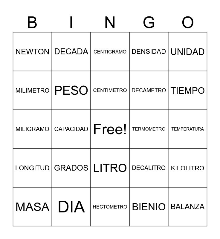 This bingo card has a free space and 39 words: FISICA, KILO, VOLUMEN, PESO, MASA, LITRO, CENTIMETRO, METRO, UNIDAD, LONGITUD, CAPACIDAD, DENSIDAD, BALANZA, TEMPERATURA, TERMOMETRO, GRADOS, KILOMETRO, NEWTON, MILILITRO, DECALITRO, MILIMETRO, HECTOMETRO, DECAMETRO, TIEMPO, SEGUNDO, MINUTO, HORA, BIMESTRE, LUSTRO, DECADA, MILENIO, HECTOLITRO, CENTIGRAMO, DIA, BIENIO, SIGLO, KILOLITRO, MILIGRAMO and SEMESTRE.