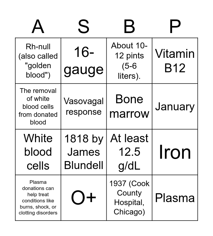 This bingo card has 26 words: Free!, Blood pressure, hemoglobin, temperature, pulse, January, World War II, The removal of white blood cells from donated blood, Rh-null (also called "golden blood"), Vasovagal response, 16-gauge, 1937 (Cook County Hospital, Chicago), Low hemoglobin levels, White blood cells, At least 12.5 g/dL, AB-, Karl Landsteiner, Iron, 1985, Vitamin B12, Plasma, About 10-12 pints (5-6 liters)., Plasma donations can help treat conditions like burns, shock, or clotting disorders, 1818 by James Blundell, Four – Whole blood, platelet, plasma, and double red cell donation, O+, At least 13.0 g/dL, Bone marrow and 41.