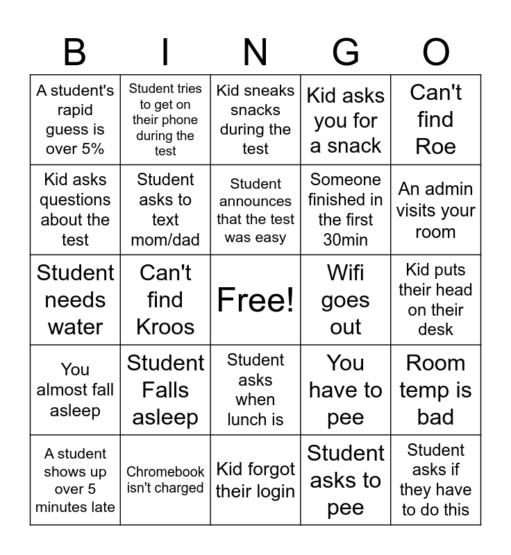 This bingo card has a free space and 24 words: Student Falls asleep, Chromebook isn't charged, Student announces that the test was easy, A student shows up over 5 minutes late, Can't find Roe, A student's rapid guess is over 5%, Kid asks questions about the test, Student tries to get on their phone during the test, Wifi goes out, Student asks when lunch is, Someone finished in the first 30min, Student needs water, You have to pee, Room temp is bad, Student asks to text mom/dad, Student asks to pee, Kid puts their head on their desk, Kid sneaks snacks during the test, An admin visits your room, Can't find Kroos, Student asks if they have to do this, You almost fall asleep, Kid asks you for a snack and Kid forgot their login.