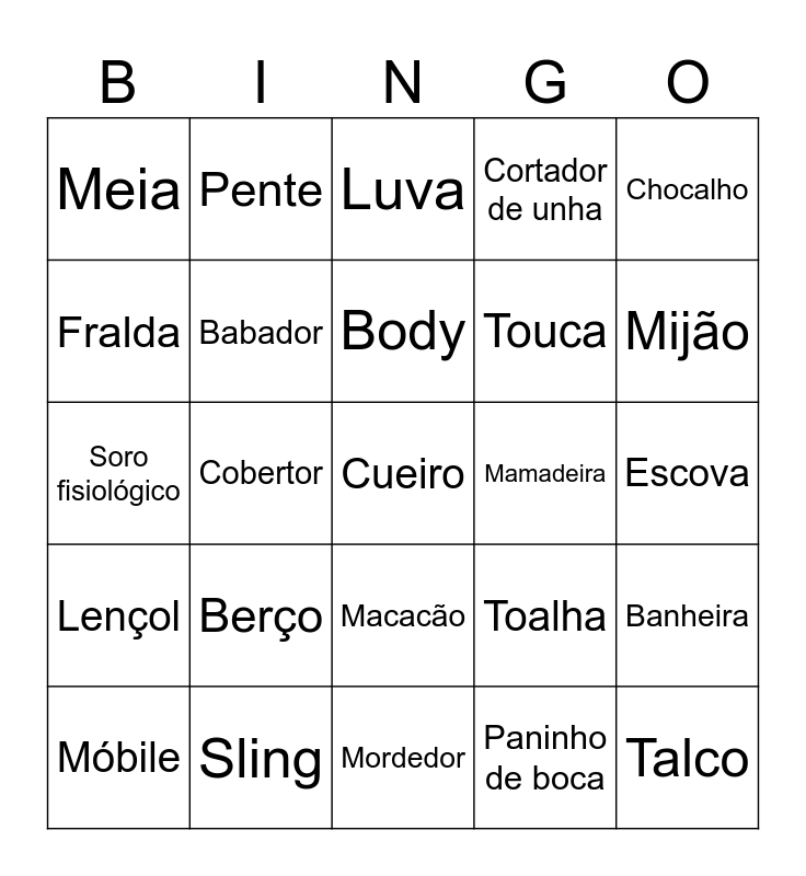 This bingo card has 37 words: Free!, Algodão, Álcool 70%, Babador, Banheira, Berço, Body, Carrinho de bebê, Chocalho, Chupeta, Cobertor, Cortador de unha, Cueiro, Escova, Fralda, Lençol, Lenço umedecido, Luva, Macacão, Mamadeira, Meia, Mijão, Móbile, Mordedor, Naninha, Paninho de boca, Pente, Pomada, Sabonete, Sapatinho, Shampoo, Sling, Soro fisiológico, Talco, Toalha, Touca and Trocador.